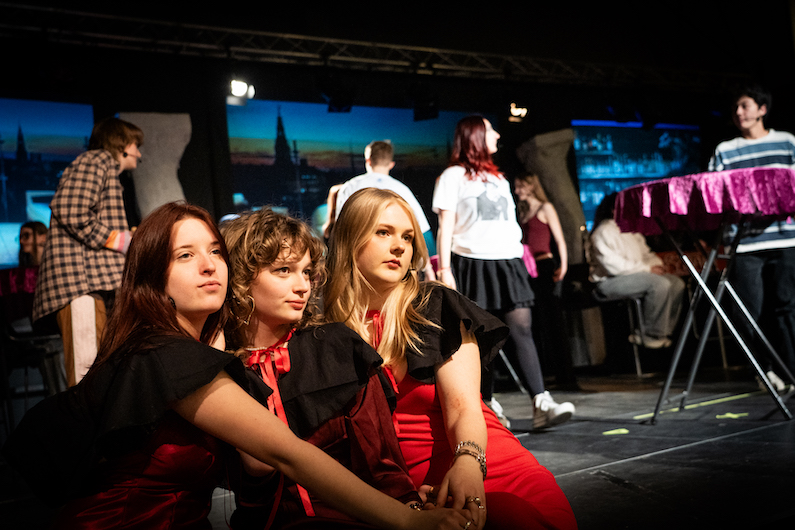 Forestillingen udvikles undervejs i øveforløbet i samarbejde mellem eleverne og lærerne.